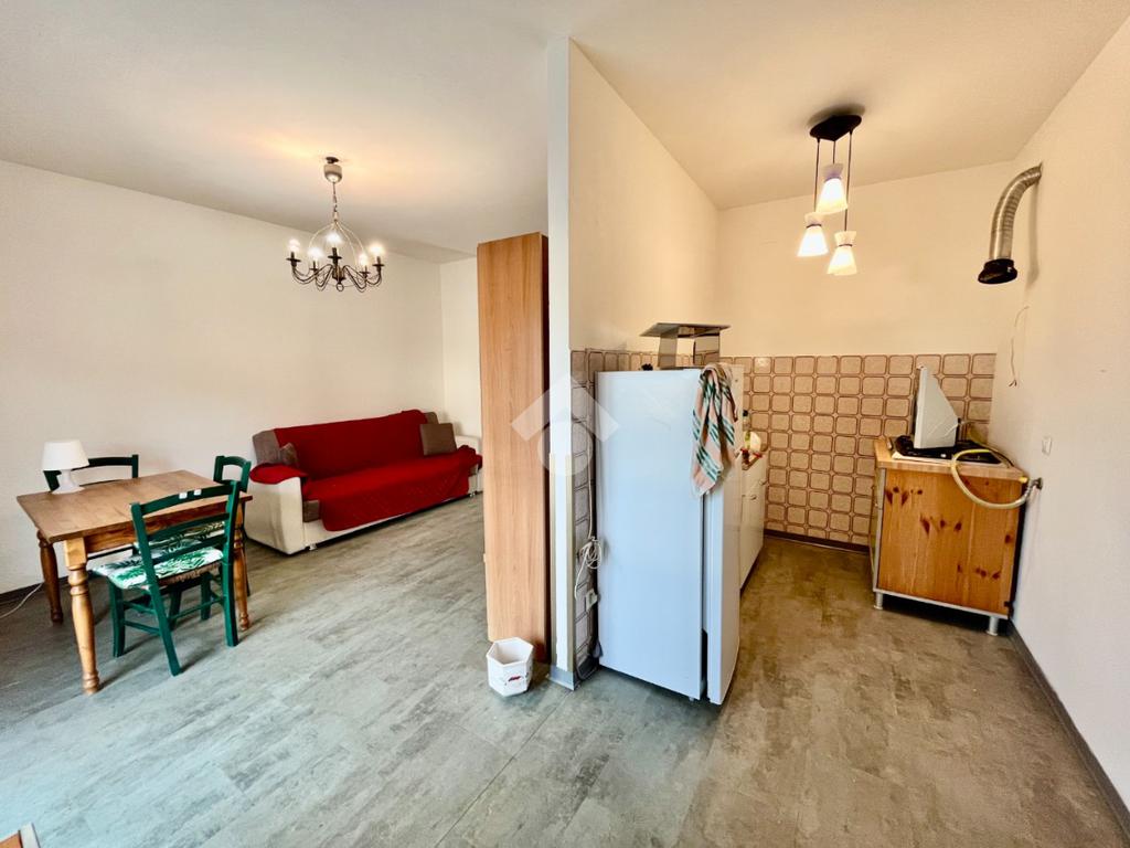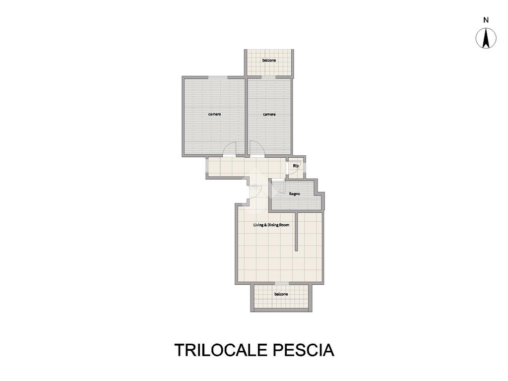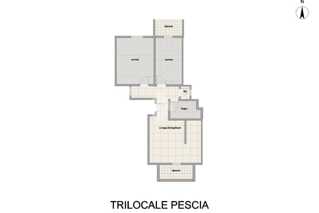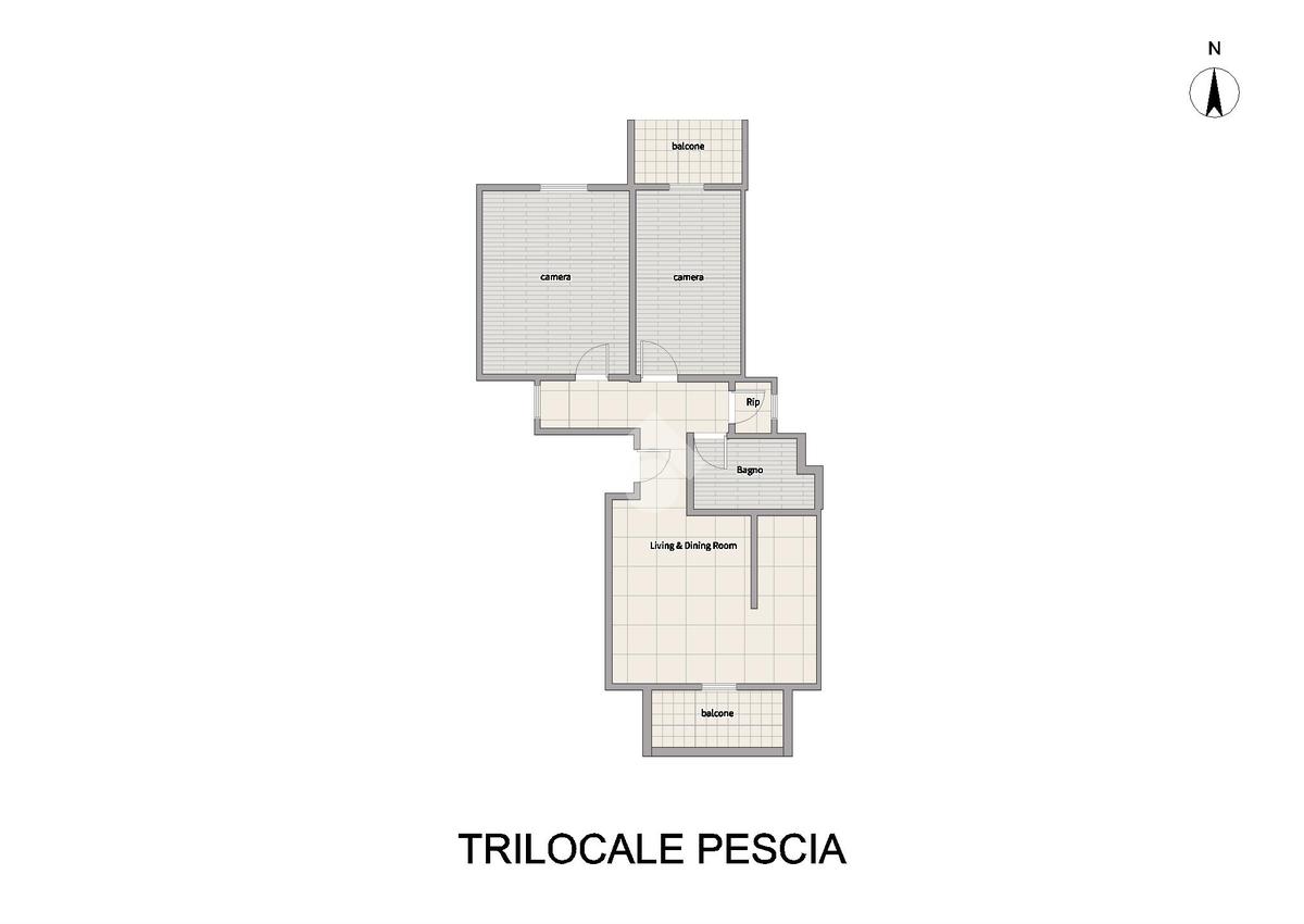 L'immobile è composto da soggiorno, cucinotto, camera matrimoniale, camera doppia, bagno con doccia, ripostiglio e due balconi.